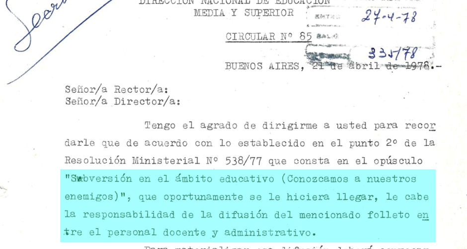 Algunas de las circulares que regían en la educación pública, durante la última dictadura militar